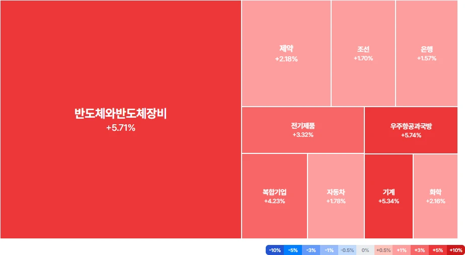 분석: 반도체와반도체장비 업종이 5.71% 상승하며 시장을 주도하고 있고, 우주항공과국방, 기계 업종 또한 높은 상승률을 기록하며 강세를 보이고 있습니다. 전반적으로 상승세가 우세한 가운데, 특히 반도체 및 기술 관련 업종에 자금 쏠림이 나타나는 것으로 해석됩니다. 기술 성장주 중심의 투자 전략이 유효할 수 있습니다.