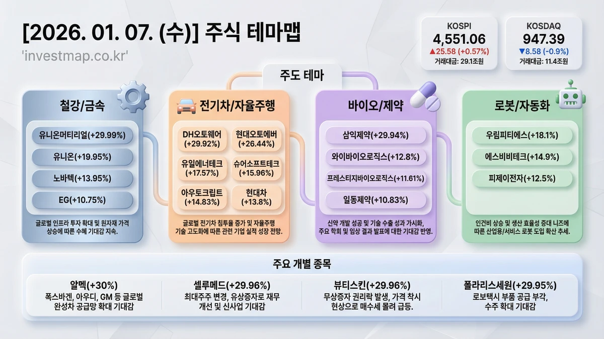 2026년 1월 7일 주식테마맵 - 주요 테마별 급등주 및 상승 이유 한눈에 보기
