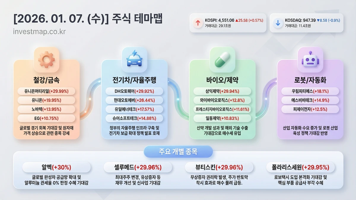 2026년 1월 7일 주식테마맵 - 주요 테마별 급등주 및 상승 이유 한눈에 보기