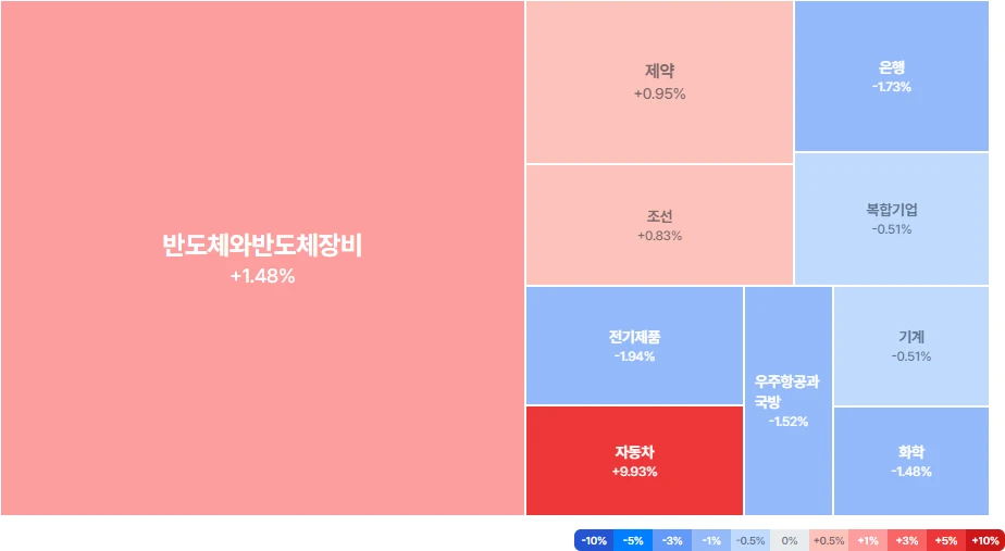 분석: 자동차 업종이 9.93% 급등하며 두드러진 강세를 보였고, 반도체 업종도 상승세를 이어가며 시장을 주도하고 있습니다. 반면, 은행, 전기제품, 화학 업종은 하락세를 보이며 투자 심리가 위축된 것으로 보입니다. 자동차 업종의 강세에 주목하며 관련주의 추가 상승 여력을 살펴볼 필요가 있습니다.