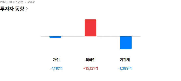2026년 1월 7일 투자자별 매매 동향 - 개인 순매도, 외국인 순매수, 기관 순매도