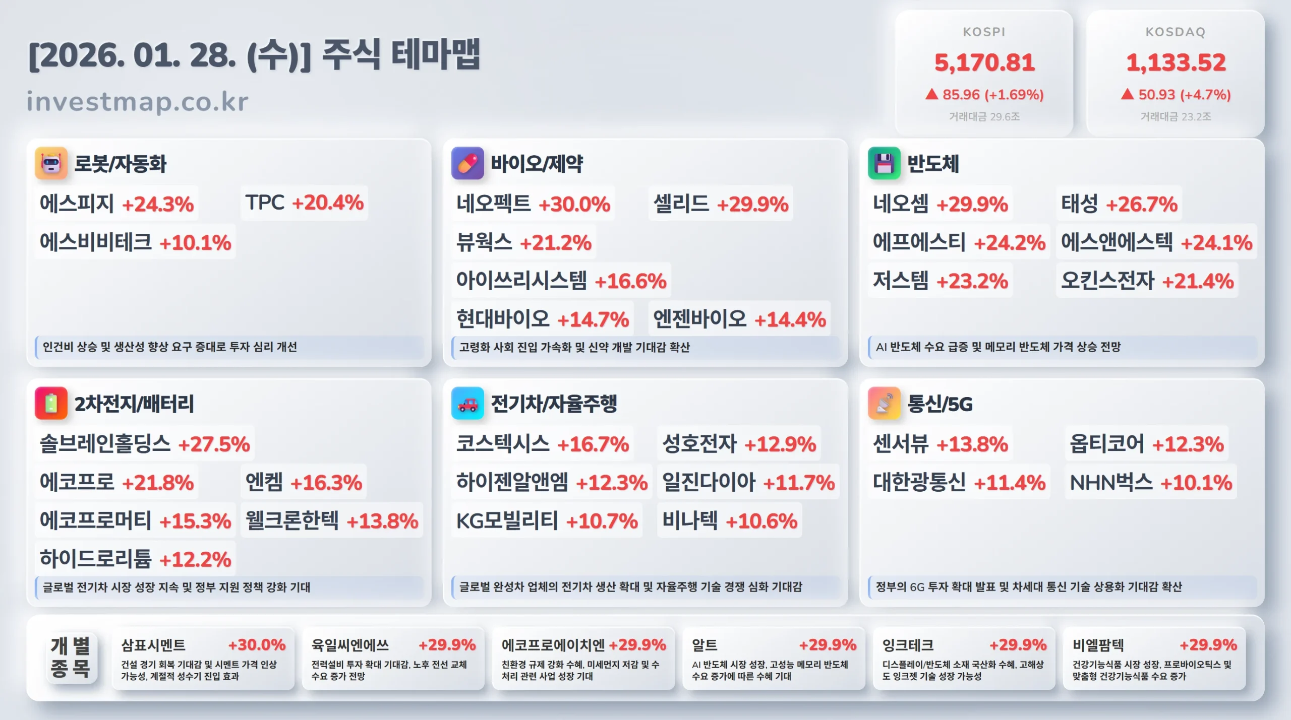 오늘 하루도 수고 많으셨습니다. 2026. 01. 28. (수) 주식시장 마감 시황과 주요 테마를 정리한 주식테마맵입니다.