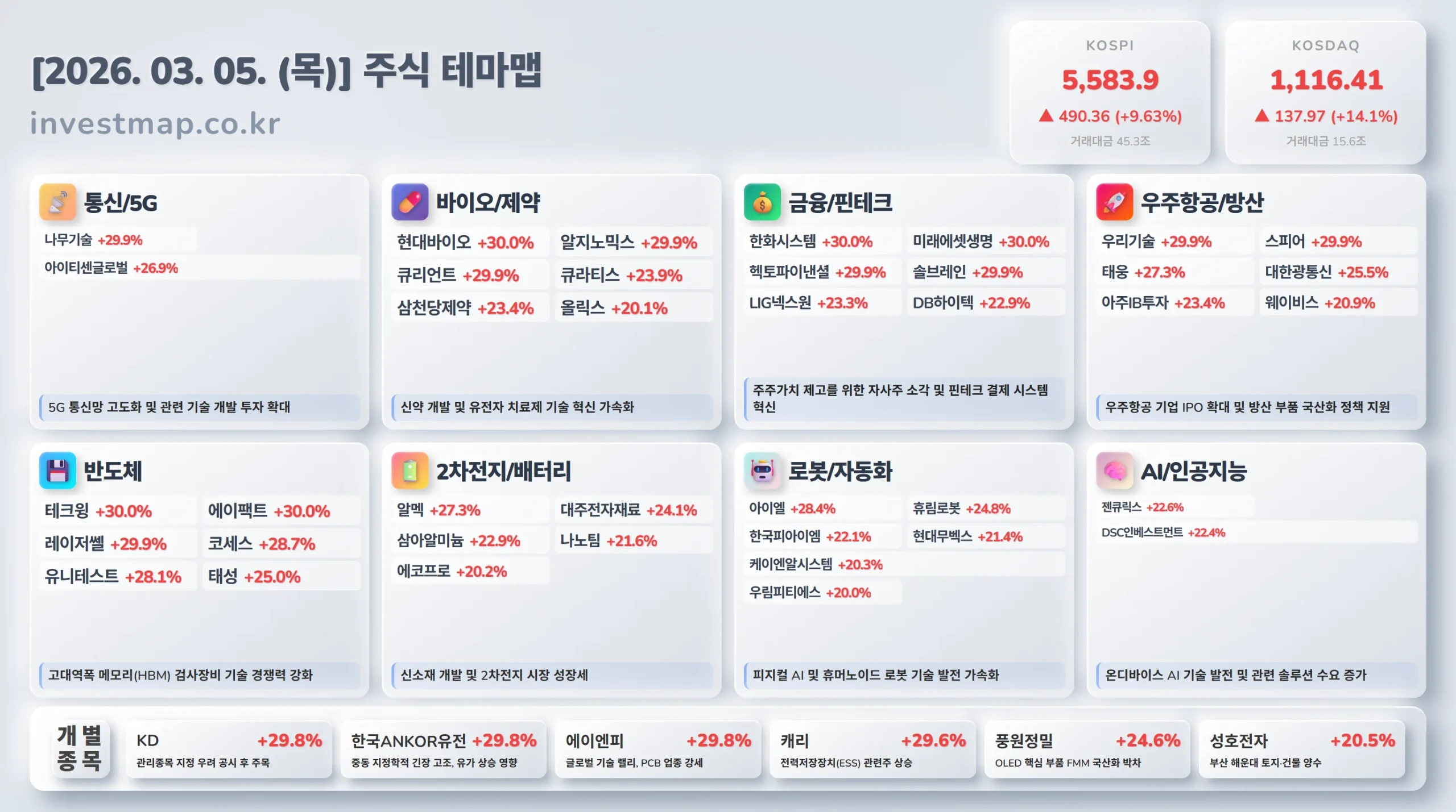 2026년 3월 5일 주식테마맵 - 주요 테마별 급등주 및 상승 이유 한눈에 보기
